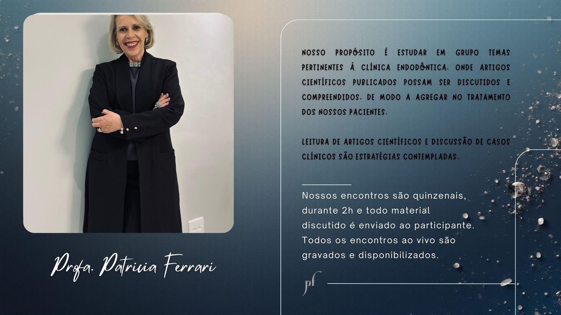 Os cursos da professora Patrícia Ferrari são simplesmente espetaculares! Conteúdo de qualidade com embasamento científico, além de experiência clínica e uma didática que é fantástica! Super recomendo para todos que queiram se entusiasmar e aprimorar na Endodontia.